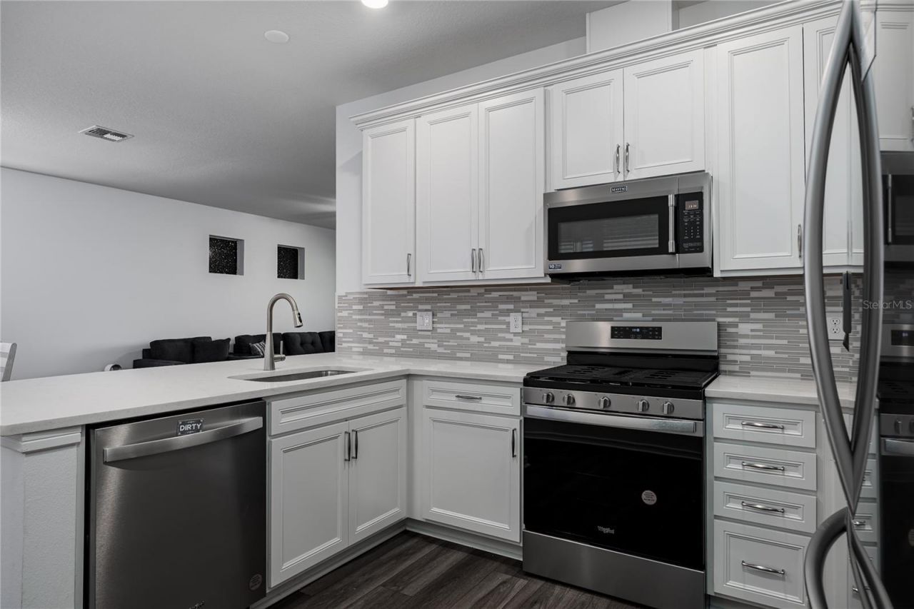 Why wait to build when this 2023, move-in ready home already offers preserve views and completed upgrades? Built by Pulte Homes, this 2-bedroom, 2-bath villa with a den features 1,542 square feet of thoughtfully designed living in the 55+ community of Del Webb at Bayview. Backing to a wooded preserve, the home provides a rare sense of privacy with peaceful nature views. With the community now built out, there are no remaining opportunities to build new within Del Webb at Bayview, making this a limited opportunity to enjoy one of North Manatee County's most established active adult communities.Luxury vinyl plank flooring flows throughout the main living areas, creating a cohesive, low-maintenance interior. The kitchen is well-appointed for both everyday living and entertaining, featuring stainless steel appliances, quartz countertops, a glass tile backsplash, and ample prep space. Sliding glass doors open to the rear lanai, complete with a power retractable sunshade for added comfort during sunny afternoons.The flexible den is currently used as a home office and offers versatility for a hobby room, media space, or guest accommodations. The primary suite easily fits a king-size bedroom set and includes a walk-in shower with glass enclosure, subway tile, built-in bench seating, and a dual-sink vanity. Both bathrooms and the interior laundry room are finished with ceramic tile flooring.Outdoor living is highlighted by the rear lanai with wide-view screens that preserve uninterrupted views of the wooded backdrop-an ideal space to enjoy quiet mornings and evening sunsets. An attached two-car garage adds everyday convenience.Del Webb at Bayview offers a maintenance-free, amenity-rich lifestyle with a full-time Lifestyle Director, resort-style pool, fitness center, tennis and pickleball courts, on-site dining, and a full calendar of social activities. Conveniently located along the Moccasin Wallow corridor with quick access to I-75, Tampa, St. Petersburg, and Sarasota, and close to new shopping, dining, hospitals, and the upcoming Seaire Crystal Lagoon. An excellent opportunity to enjoy newer construction and resort-style living in a growing area.